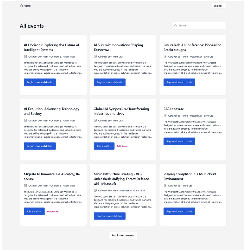 Les principales capacités incluent une grille d’événements réactive, la recherche par nom ou description, des informations détaillées sur les événements et un formulaire d’inscription intégré.